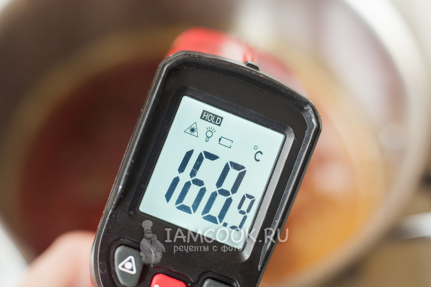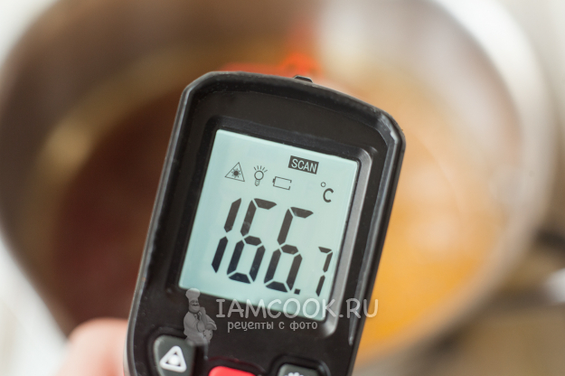 В идеале ее температура должна достичь 160-180 градусов (чем выше температура, тем темнее получится карамель). Если перегреете, получится жженка. Температуру можно измерить термометром-щупом или пирометром. Но учитывайте, что термометр-щуп показывает температуру с опозданием, по мере нагревания датчика, а пирометр измеряет поверхностную температуру. Я измеряла пирометром, поэтому решила остановиться примерно на 170 градусах (подозреваю, что нижний слой был прогрет больше), в итоге у меня получилась довольно темная карамель.