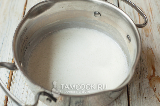 Теперь общая технология приготовления мягкой постной карамели. Одновременно с тем, как сироп начнет темнеть, поставьте на слабый огонь сливки. Их нужно прогреть до активного образования пара, но не до кипения. Рекомендуемая температура сливок для карамели – 80-90 градусов.