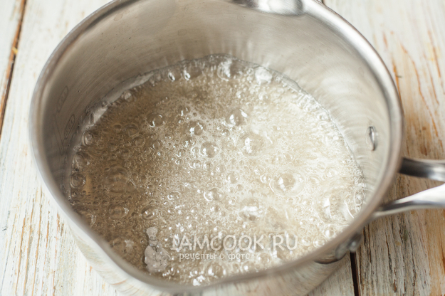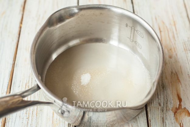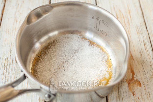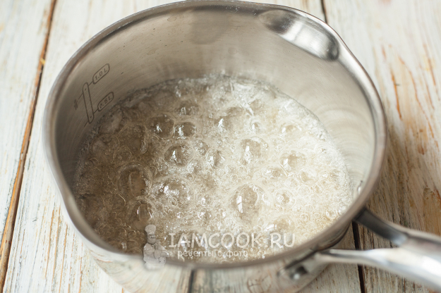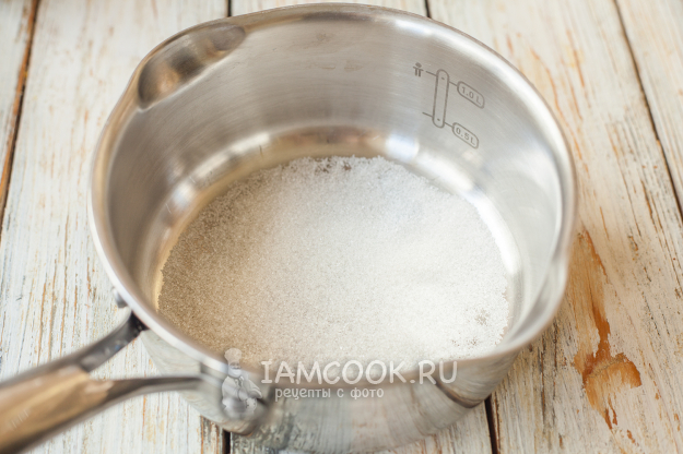 Теперь второй способ – «мокрый», с добавлением воды. Он хорош тогда, когда нужно сделать относительно большое количество карамели, например, для начинки тортов, пирожных или последующего приготовления крема. Также его я рекомендую использовать новичкам, он проще. Здесь посуда тоже должна быть с толстым дном и стенками, но ее ширина особого значения не имеет. Всыпьте сразу весь сахар в кастрюлю или ковшик, залейте горячей водой и поставьте на средний огонь.