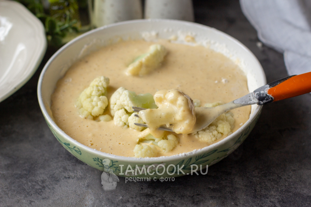 Далее возьмите соцветие отварной капусты и окуните его в кляр.