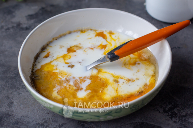 Пока остывает капуста, приготовьте кляр. Смешайте вилкой или венчиком куриные яйца, молоко и специи.