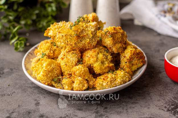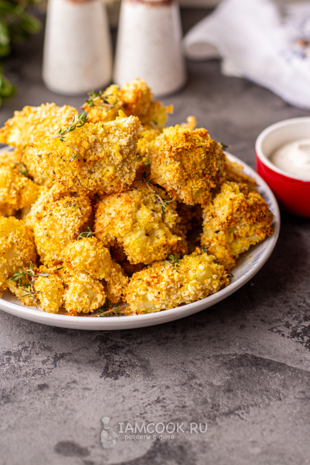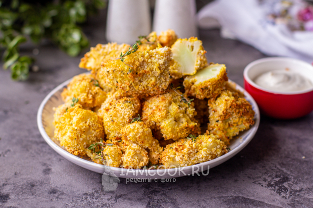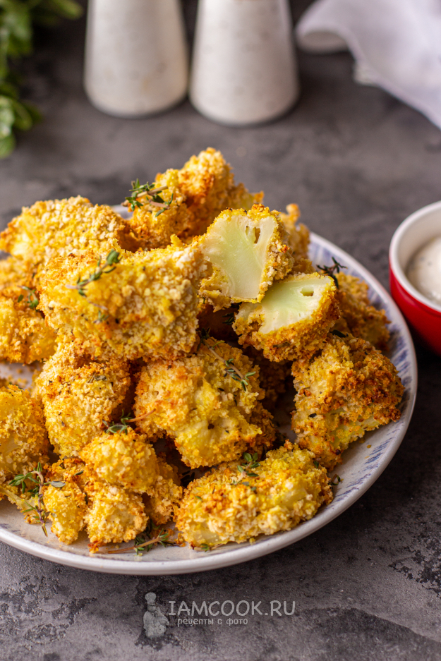 Время приготовления цветной капусты в панировочных сухарях в аэрогриле у вас может быть больше/меньше, ориентируйтесь на вид капусты - она должна быть красивого золотистого цвета. Готовую капусту переложите на блюдо и подавайте с любимым соусом, у меня сметанно-чесночный.