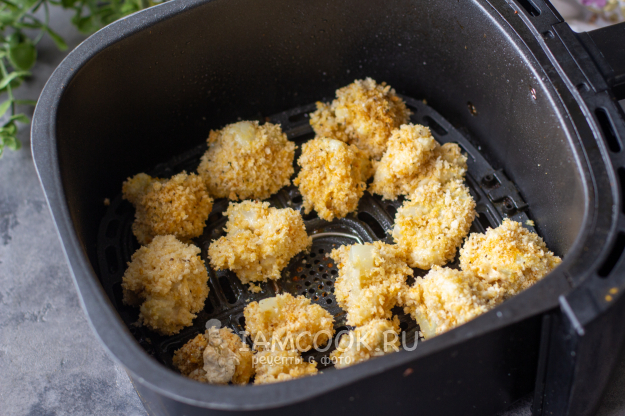 Подготовленную капусту в сухарях переложите в чашу аэрогриля на решетку, при помощи масла спрея сбрызните ее. Готовьте при температуре 190 градусов 10-12 минут.