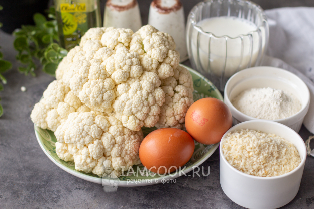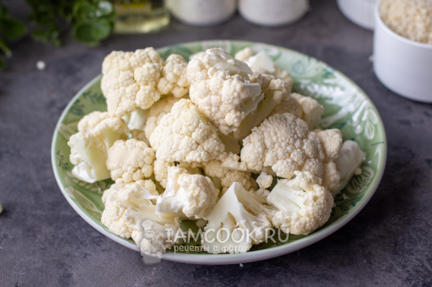 Соберите по списку все необходимые продукты для приготовления цветной капусты в панировочных сухарях в аэрогриле. Я взяла свежую цветную капусту, ее нужно будет разобрать на соцветия и отварить в подсоленной воде минуты три. Но можно взять также и замороженную, вот ее варить не нужно, а всего лишь дать ей полностью оттаять на нижней полке холодильника, а затем отжать от лишней влаги.