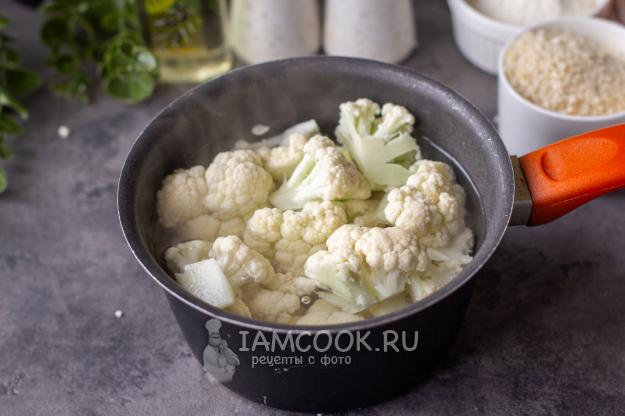 Подготовленные соцветия опустите в кипящую, слегка подсоленную воду и варите минуты 3-4. Затем откиньте капусту на сито и дайте стечь всей лишней жидкости. Оставьте ее на сите минут на 5, чтобы она немного остыла.