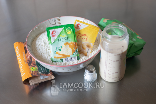 И поверх муки - дрожжи, сахар и щепотка соли.