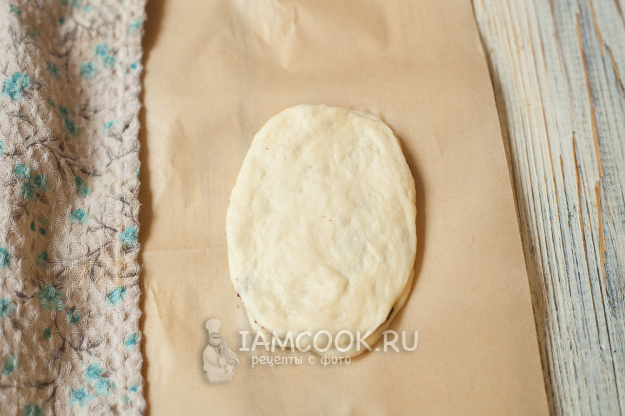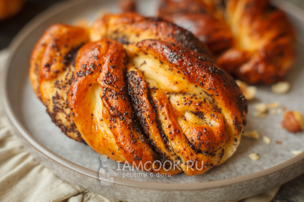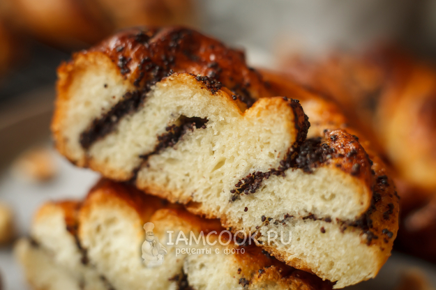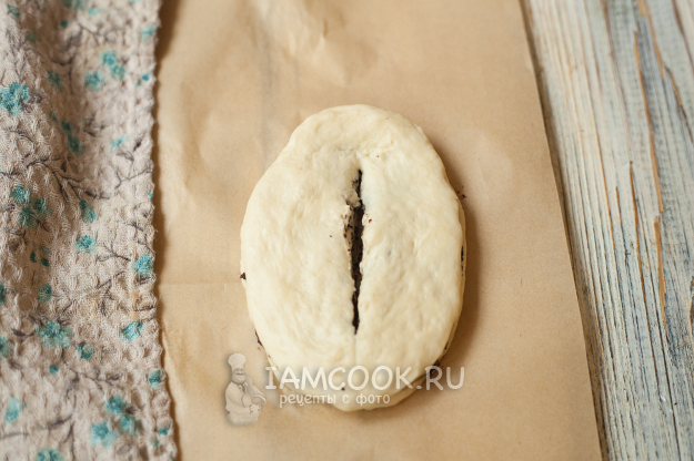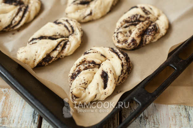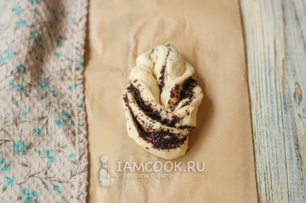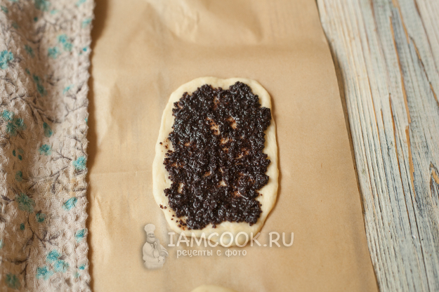 Разомните шарик в овал или прямоугольник и смажьте его слоем маковой начинки.