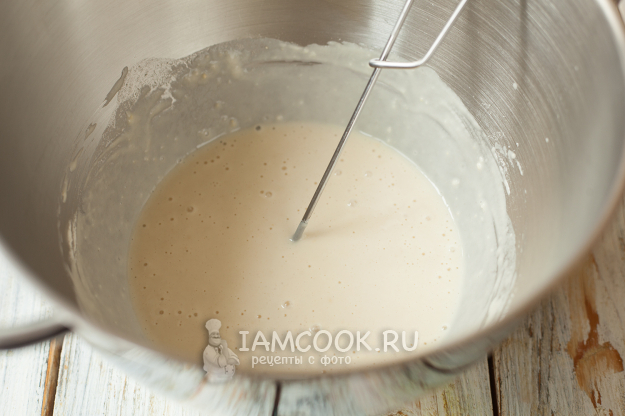 Туда же влейте подогретую до 30-40 градусов воду (сразу всю) и перемешайте все венчиком, чтобы не оставалось комочков дрожжей или муки. Опара готова, по консистенции она будет чуть жиже, чем тесто на оладьи. Теперь ей нужно дать время для созревания. Поэтому накройте миску полотенцем или пленкой и поставьте в тепло. 20-30 минут будет достаточно для того, чтобы дрожжи «проснулись» и начали работать в полную силу.