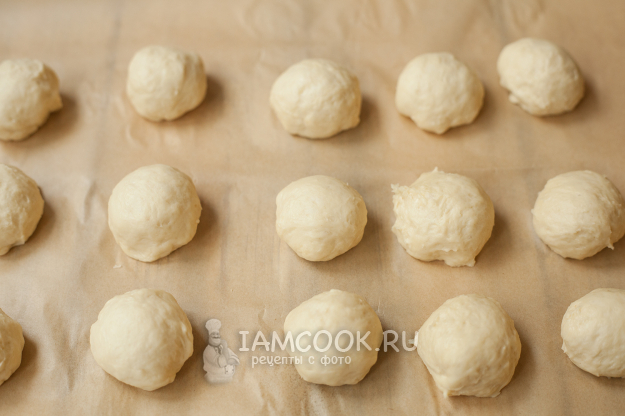 Если планируете сворачивать булочки так же, как я, разделите тесто на кусочки весом 20-25 г, важно, чтобы их количество было кратно 3. Каждый кусочек обомните и сформируйте шарик. Отложите 3 шарика, остальные пока уберите под полотенце.