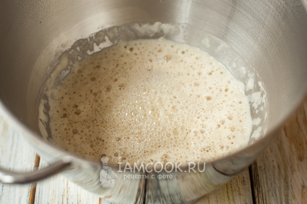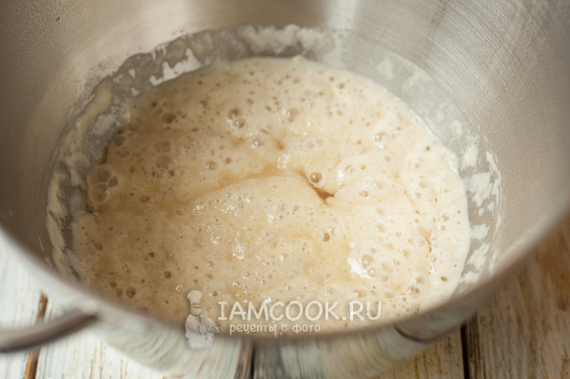 Через 20-30 минут проверьте опару. Если она стала пузыристой и воздушной, можно замешивать тесто дальше.