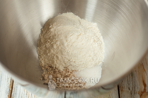 Тесто готовится опарным способом. Можно завести опару в отдельной емкости, но я обычно готовлю ее прямо в той посуде, в которой планирую замешивать тесто. Прессованные дрожжи поломайте на мелкие кусочки и высыпьте в глубокую миску, добавьте примерно 1,5 ст.л. сахара и 150 г просеянной муки.