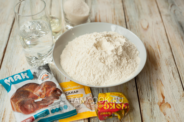 Вот из такого набора продуктов готовятся постные булочки с маком. Вместо сухого мака можно взять и готовую маковую начинку (маковый конфитюр), главное, чтобы в ее состав не входил сухой яичный белок. Прессованные дрожжи легко заменяются сухими – их понадобится втрое меньше, то есть примерно 5 г.