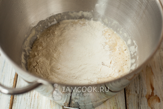 Далее очередь муки. Ее нужно добавлять порциями: сначала половину от оставшегося количества, а потом подсыпайте буквально по 30-50 г. Тесто не должно получиться забитым. Если у вас мука с высоким содержанием белка, то всё количество может и не понадобиться. Пока тесто жидкое, перемешивайте его ложкой или скребком, потом выложите на стол (разделочную доску) и продолжайте месить руками.