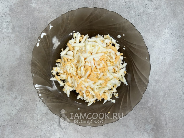 Остудите яйца, очистите от скорлупы и натрите на крупной терке.