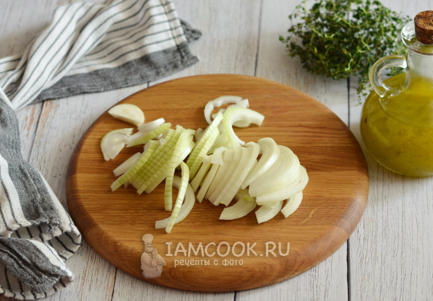 Очистите и ополосните луковицу, нарежьте её полукольцами.