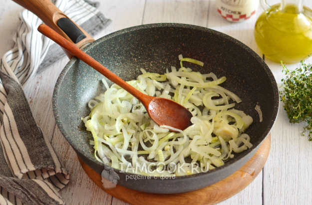Разогрейте в сковороде оливковое масло и слегка обжарьте нарезанный лук, до прозрачности.