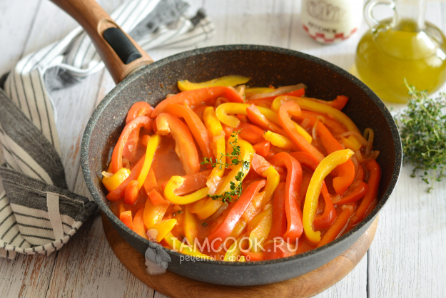 Влейте немного воды и доведите до кипения. Тушите болгарский перец под крышкой около 10-15 минут.