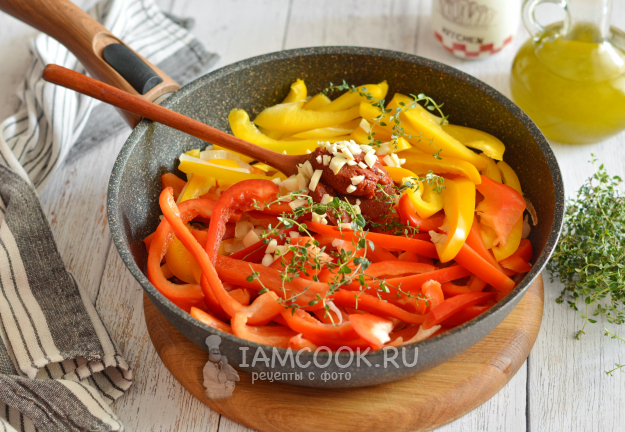 Добавьте в сковороду нарезанный болгарский перец, нарубленный мелко чеснок, томатную пасту.