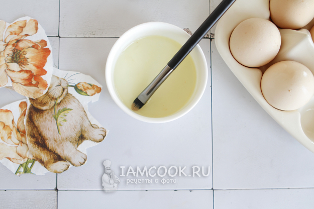 Отделите белок от желтка. Желток уберите в холодильник, а вот белок нам понадобится. Слегка разбейте его вилкой и приготовьте кисточку.