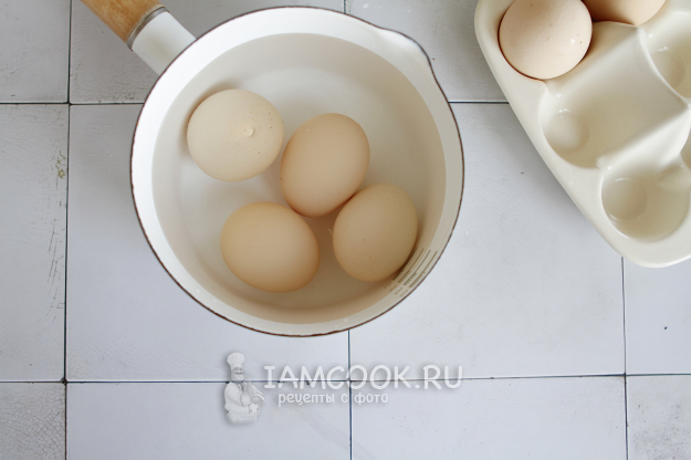 Переложите яйца в кастрюлю, влейте воду и отправьте на плиту. Как только закипит вода, убавьте огонь и варите яйца 8-10 минут.