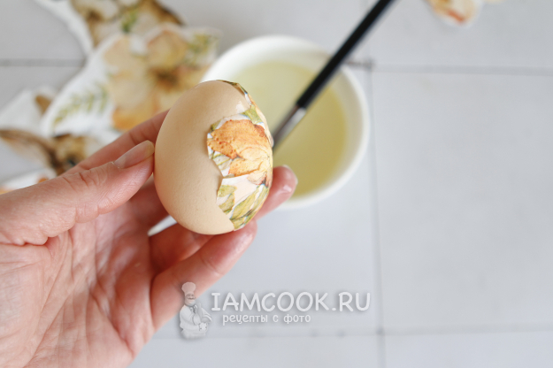 Берем фрагмент рисунка, кисточку смазываем в белке, и аккуратно приклеиваем его к яйцу.