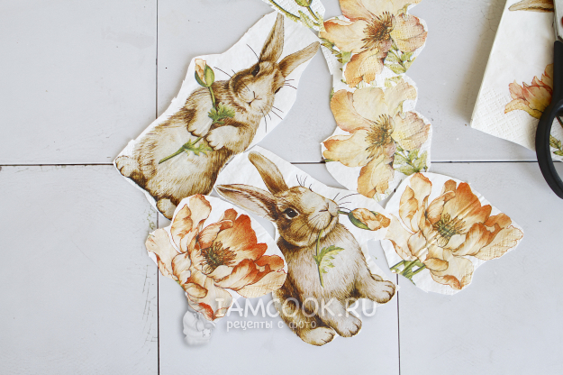 Пока остывают яйца, подготовьте салфетки. Вырежьте понравившиеся фрагменты рисунка. Из своего опыта скажу, что лучше выбирать салфетки с мелким рисунком, так как крупный рисунок немного сложнее в работе.