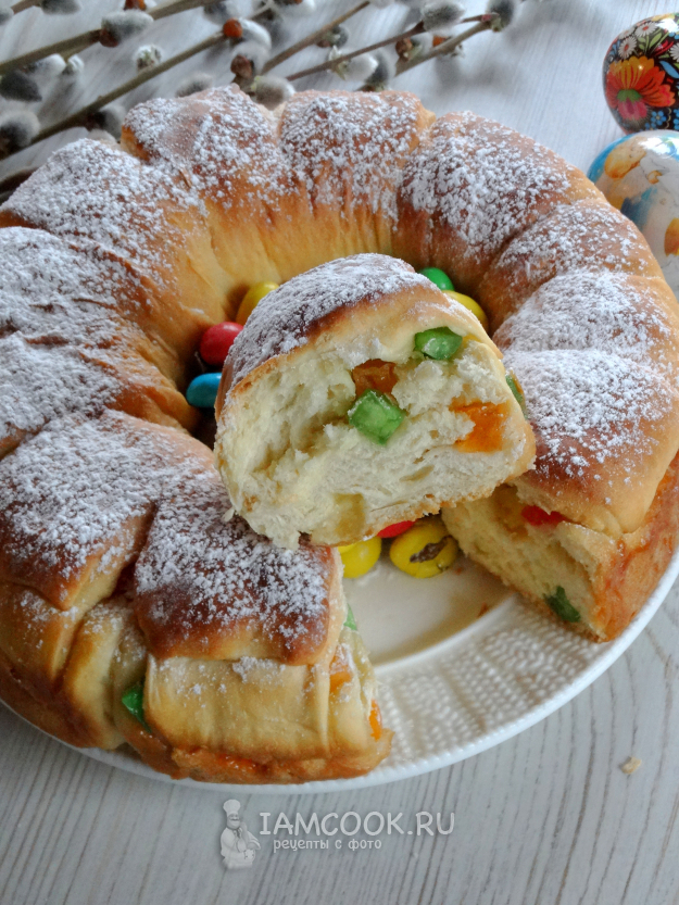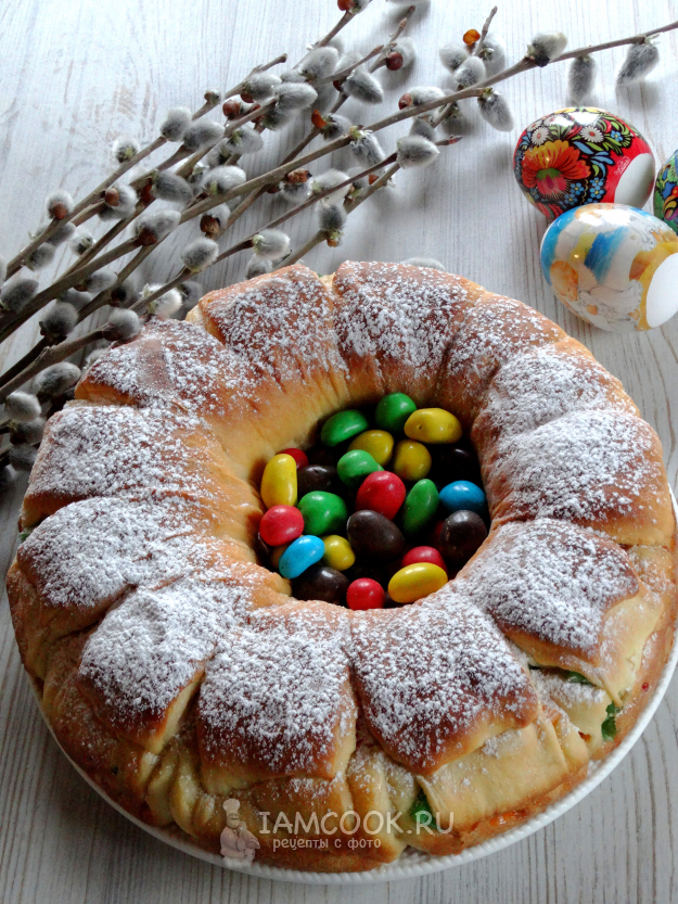 Пасхальное кольцо выпекать при температуре 180 градусов до румяного состояния.