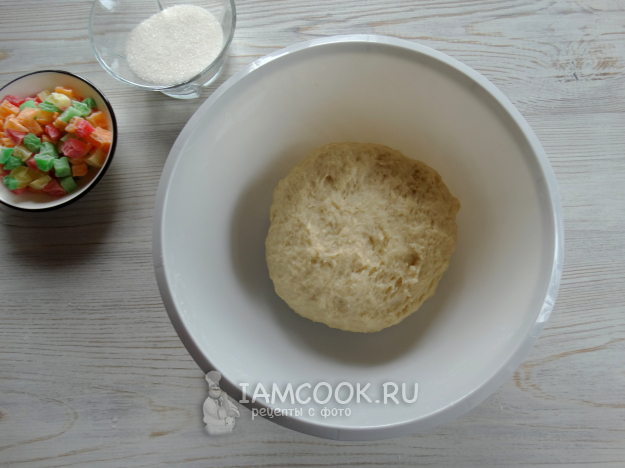 Смазать сливочным маслом, посыпать сахаром, разложить цукаты.