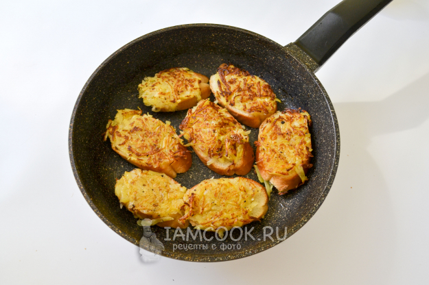 Хорошо разогрейте сковороду с растительным маслом и положите драники картофельной стороной вниз. На тихом огне жарьте драники на хлебе на сковороде до румяной корочки.