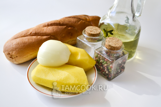 Для приготовления горячих драников на хлебе на сковороде понадобятся только картошка, лук, хлеб и растительное масло. Соль и черный молотый перец по вкусу. Картофель и лук почистите. Вместо хлеба можно взять батон или багет.