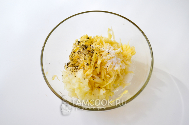 Руками отожмите из картошки сок. Добавьте к натертой картошке очень мелко нарезанный или натертый на терке лук, соль и черный молотый перец.