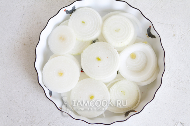 Подготовьте форму для запекания. Выложите в нее луковые кольца и слегка посолите. Форму я ничем не смазывала.