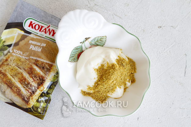 Для маринада приготовьте майонез и специи. У меня уже была готовая смесь для рыбы. В ее состав входят: соль, зерна горчицы, лук, розмарин, чеснок, смесь перцев, кориандр, лимонная цедра, имбирь, тмин. Можно купить похожий набор смеси, а можно собрать ее из своих личных предпочтений и из того, что у вас есть дома под рукой.