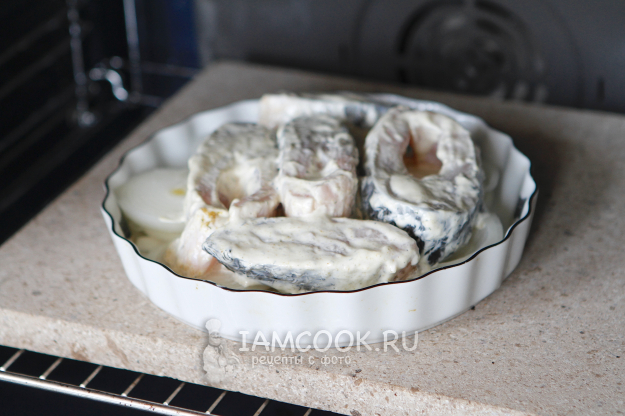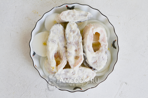 Перемешайте майонез со специями и хорошо натрите каждый кусочек сазана. Выложите их на луковую подушку.