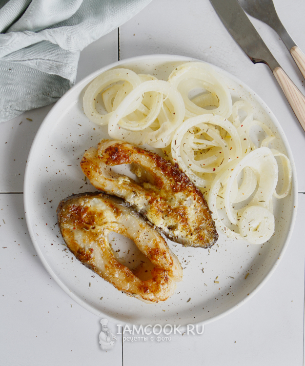 Выложите кусочки сазана вместе с луком на тарелку и подавайте к столу. Нежные кусочки сазана с мягкими сладкими луковыми кольцами на гарнир прекрасно дополняют друг друга.