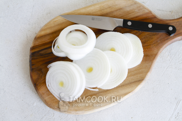 Почистите две крупных луковицы и нарежьте кольцами толщиной 3-4 мм.