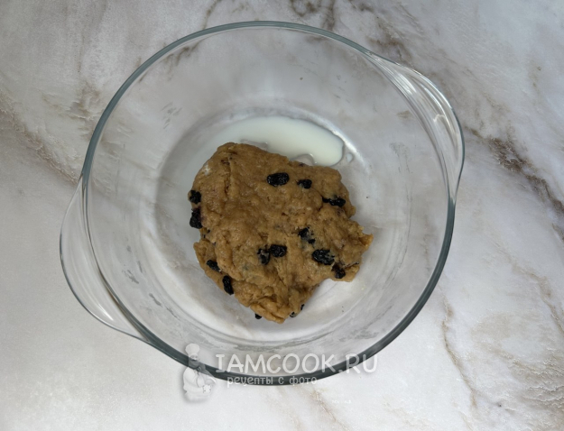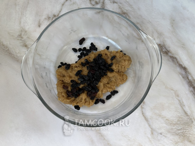Добавьте предварительно промытый и высушенный изюм. Еще раз хорошо перемешайте.