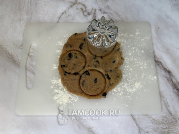 Припылите доску мукой и раскатайте тесто в пласт толщиной 5-7 мм. С помощью формочки и обычного стакана вырежьте небольшие печеньки, диаметром примерно 5 см.