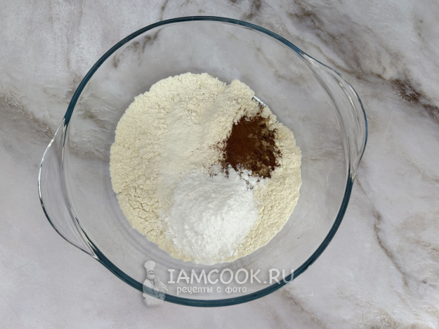 Просейте муку, добавьте разрыхлитель, молотую корицу, сахарную пудру, молотый мускатный орех и молотый имбирь.