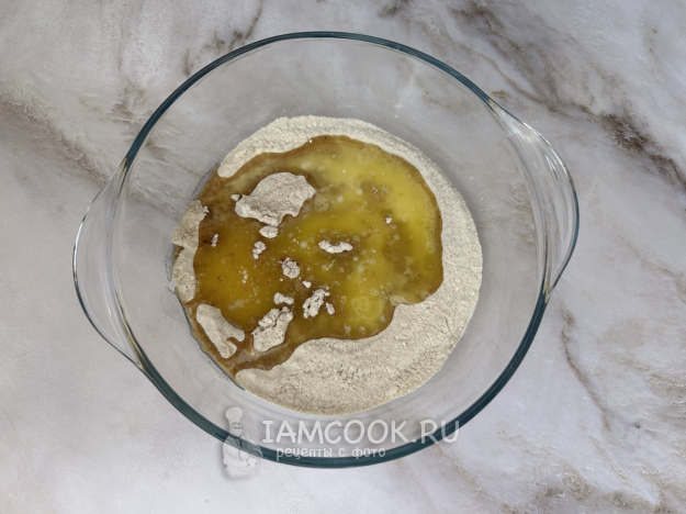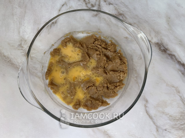 Добавьте к масляно-мучной смеси яйцо, всё хорошо перемешайте.