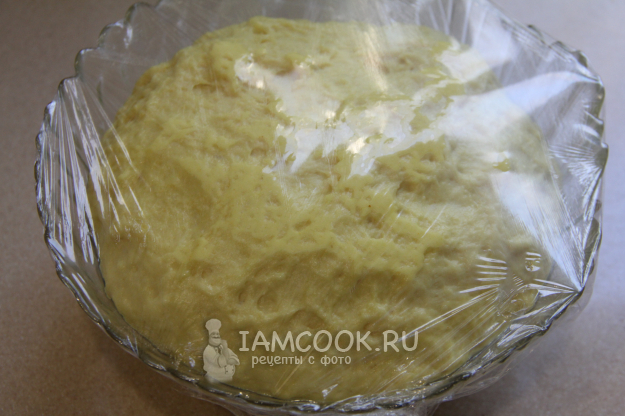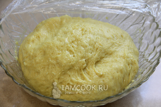 Оставить тесто в миске, накрыв пищевой пленкой, на 1,5 часа в тепле. Тесто округлится и увеличится в объеме.