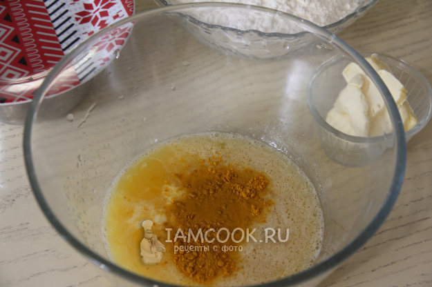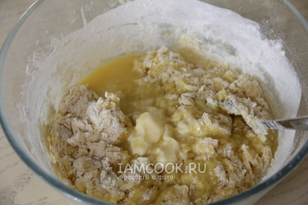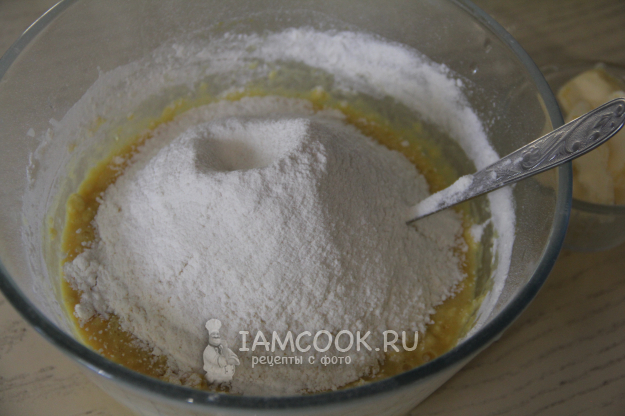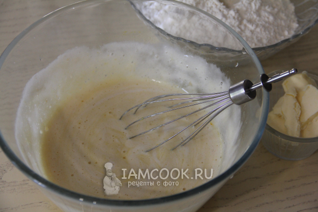 Перемешать тесто ложкой. Масло растопить и влить в тесто.