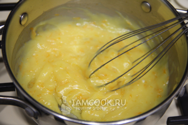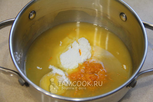 Пока куличи готовятся, приготовить апельсиновый крем. В кастрюлю влить апельсиновый сок, добавить апельсиновую цедру, желток, сахар и крахмал.