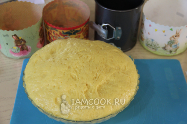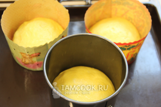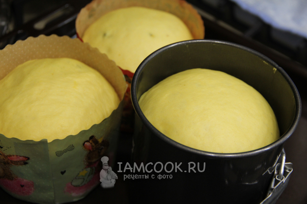 Тесто разделить на три части, по желанию добавить цукаты, изюм или капли шоколада. Выложить тесто в формы и оставить на 40 минут в тепле.