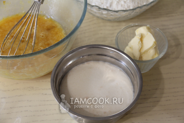 Молоко подогреть до 38 градусов и развести дрожжи в молоке, добавить 1 ч.л. сахара из общей массы. Оставить дрожжи на 20 минут.