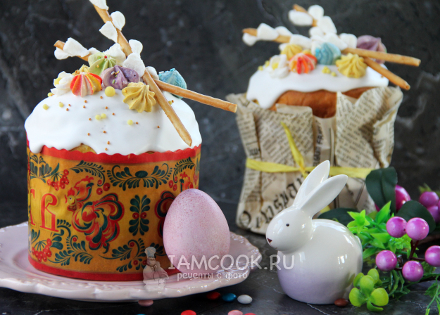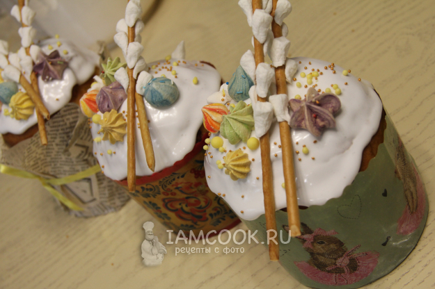Накрыть крем шапочкой от кулича. Покрыть куличи любой глазурью: белковой, желатиновой или покупной. Украсить верхушки куличей по желанию: меренгой, бусинками и цветной посыпкой.