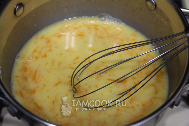 Перемешать массу венчиком. Апельсин помыть и снять с него цедру. Выдавить сок апельсина.