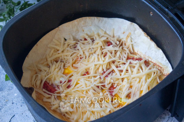 Посыпьте сверху на яйца тертым сыром и выпекайте яичницу в лаваше в аэрогриле еще 2-3 минуты при температуре 180 градусов.