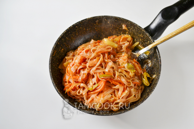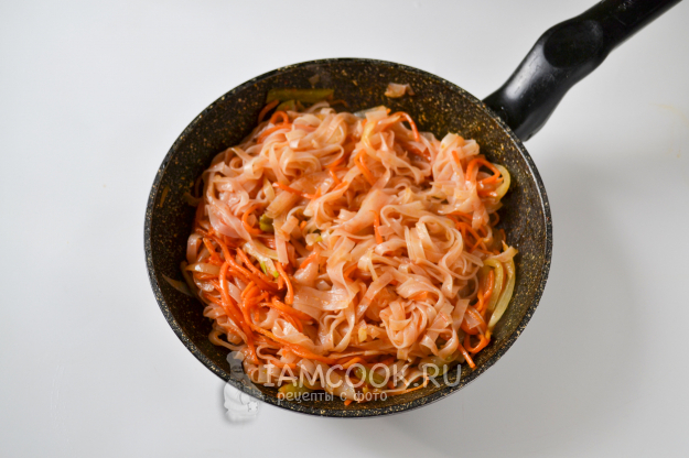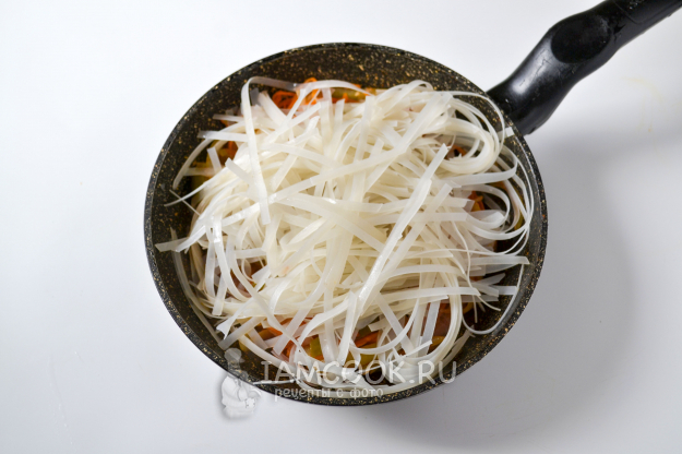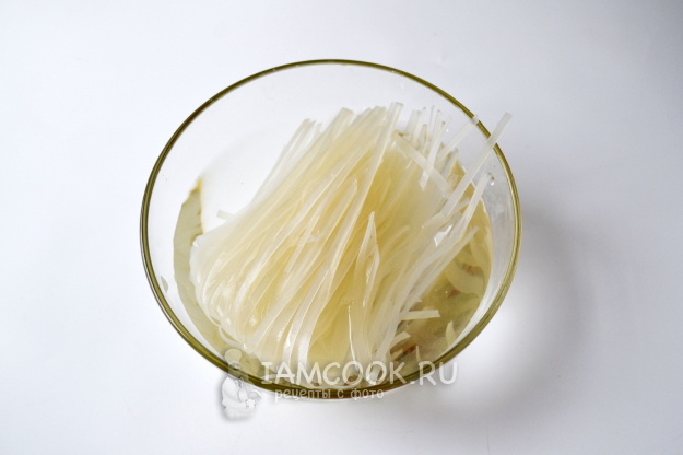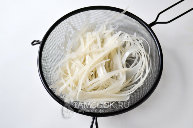 Рисовую лапшу приготовьте согласно инструкции на упаковке. Лапшу можно отварить, а можно залить кипящей водой на 20 минут.