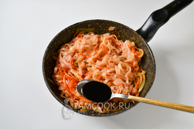 Подавайте рисовую лапшу с овощами в соевом соусе сразу со сковороды, горячей. Приятного аппетита!
